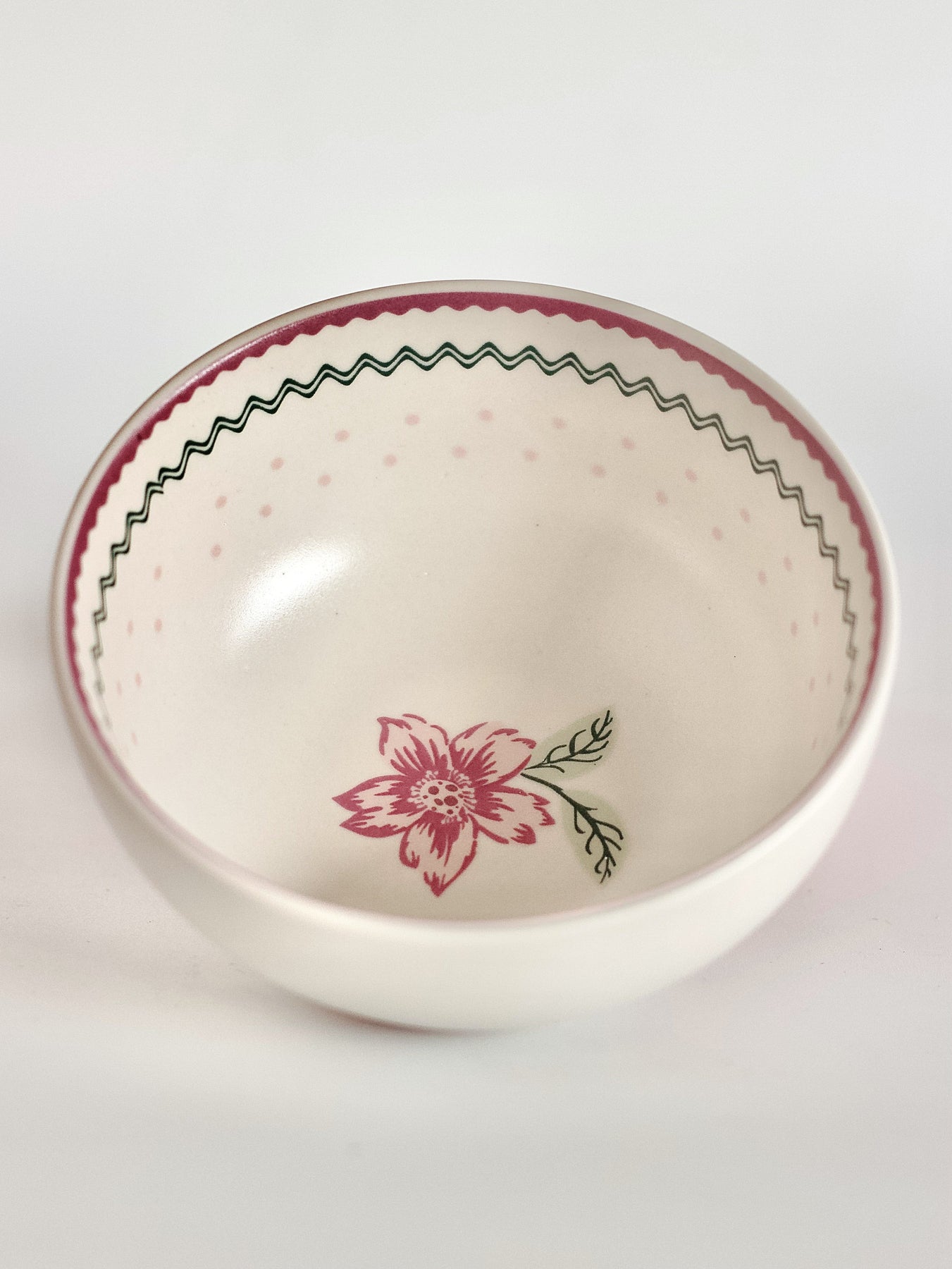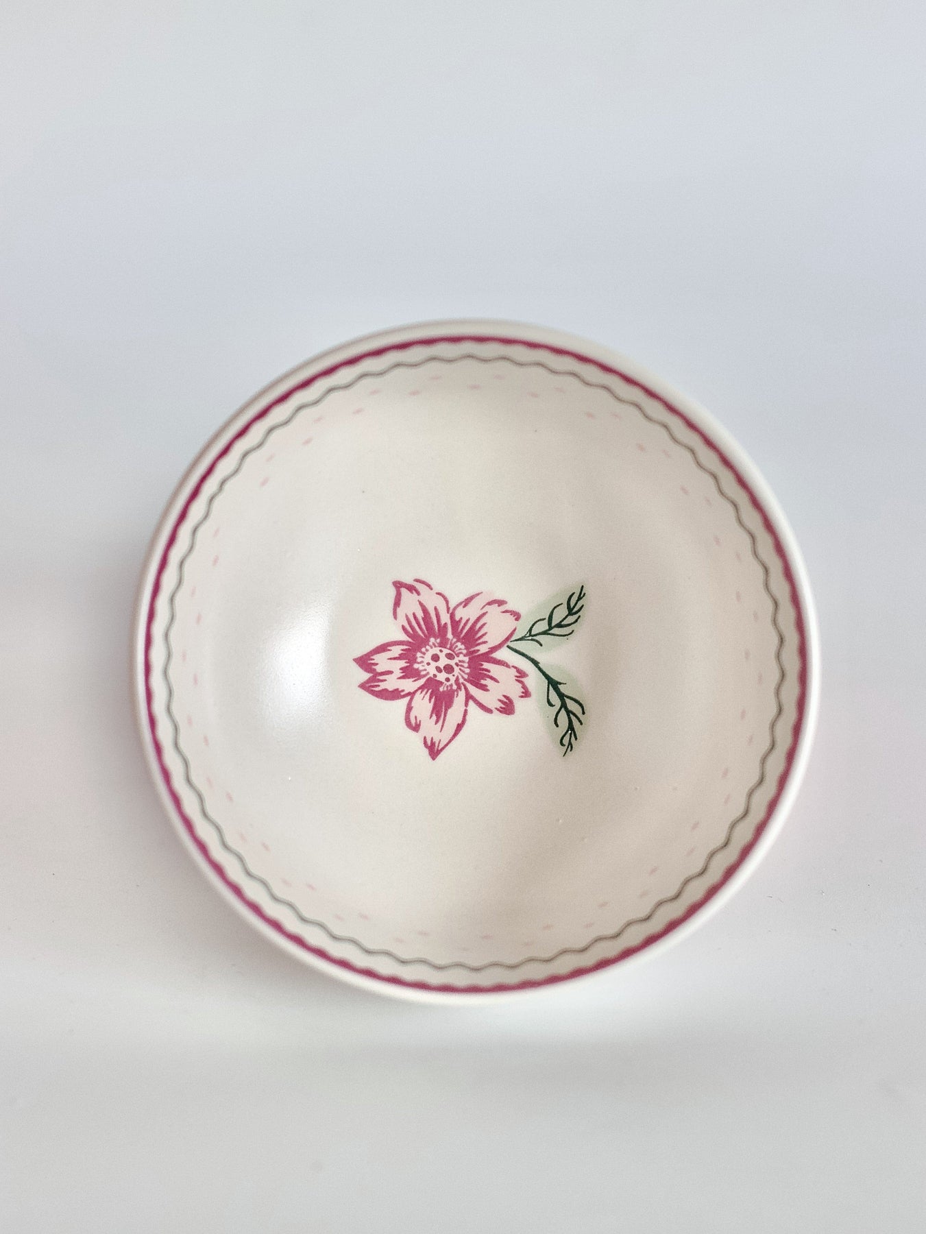 Product Description: Delicate ceramic bowl adorned with a soft floral design and subtle border detailing. Perfect for serving snacks, desserts, or small portions, bringing a gentle vintage charm to everyday dining.