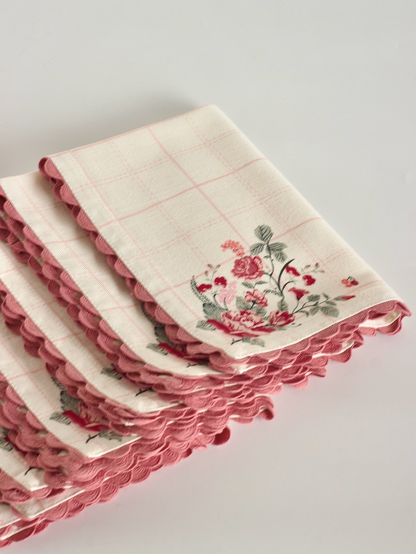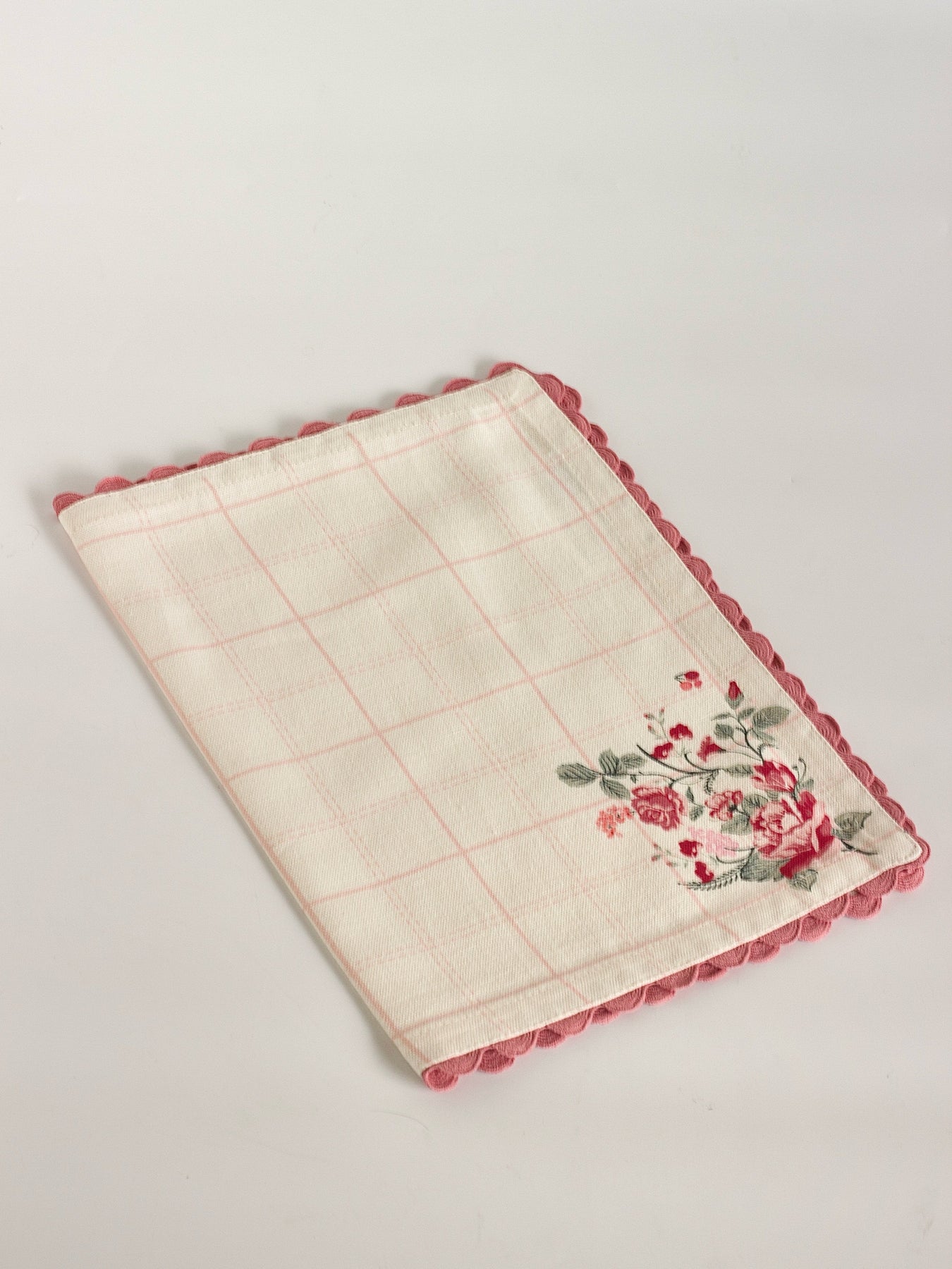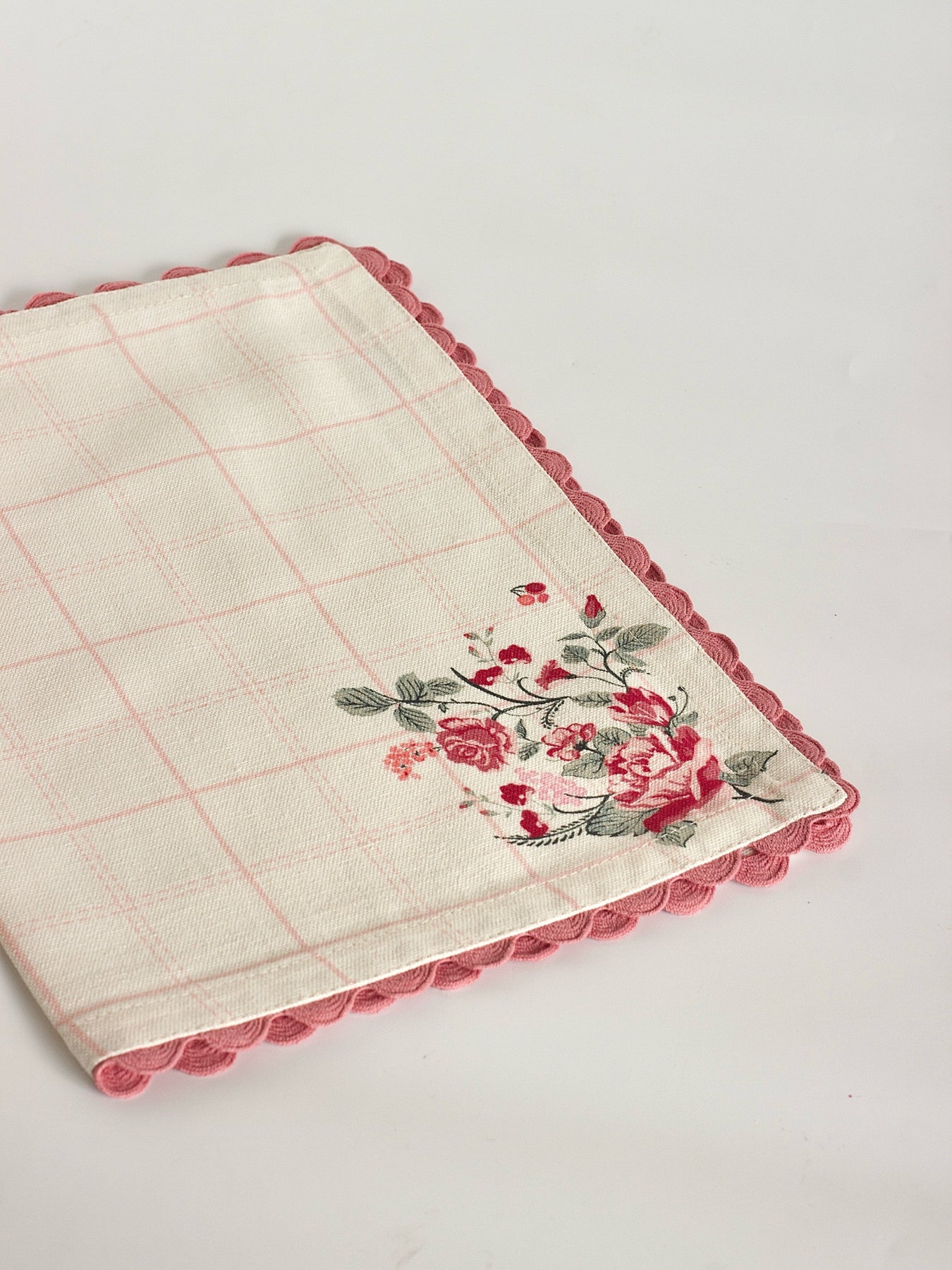 Product Description: Elegant floral placemats featuring a soft pastel grid and delicate rose motif, finished with a charming scalloped edge. Perfect for adding a vintage touch to everyday meals or special table settings.