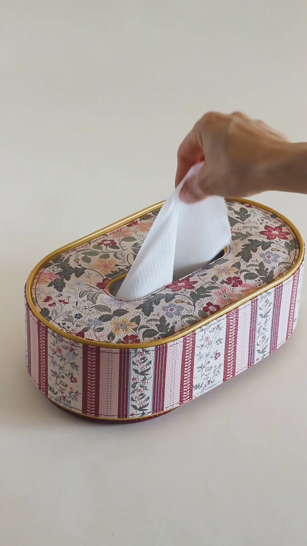 Elegant oval tissue box with a floral and striped leather cover—perfect for adding a soft, decorative touch.