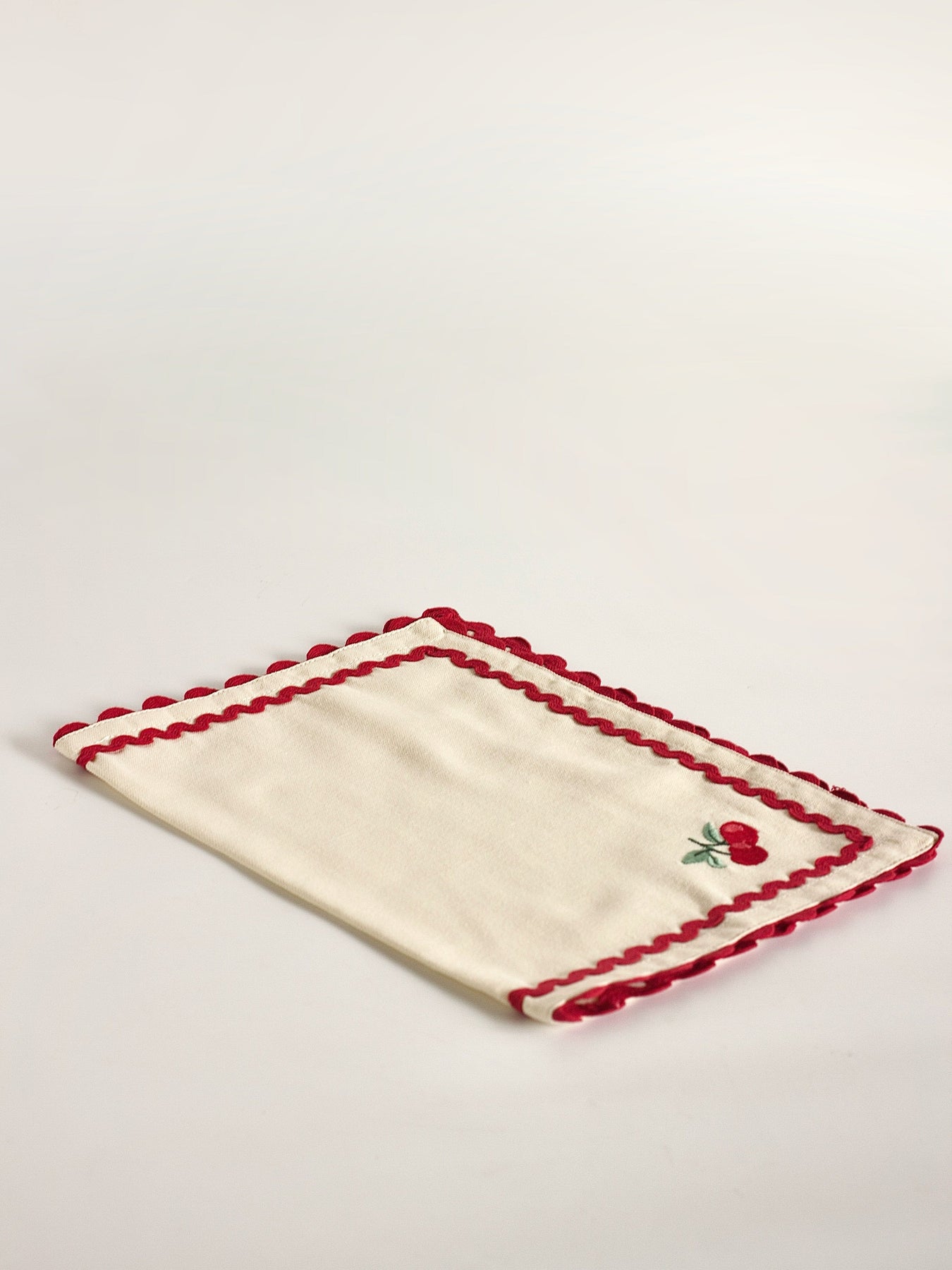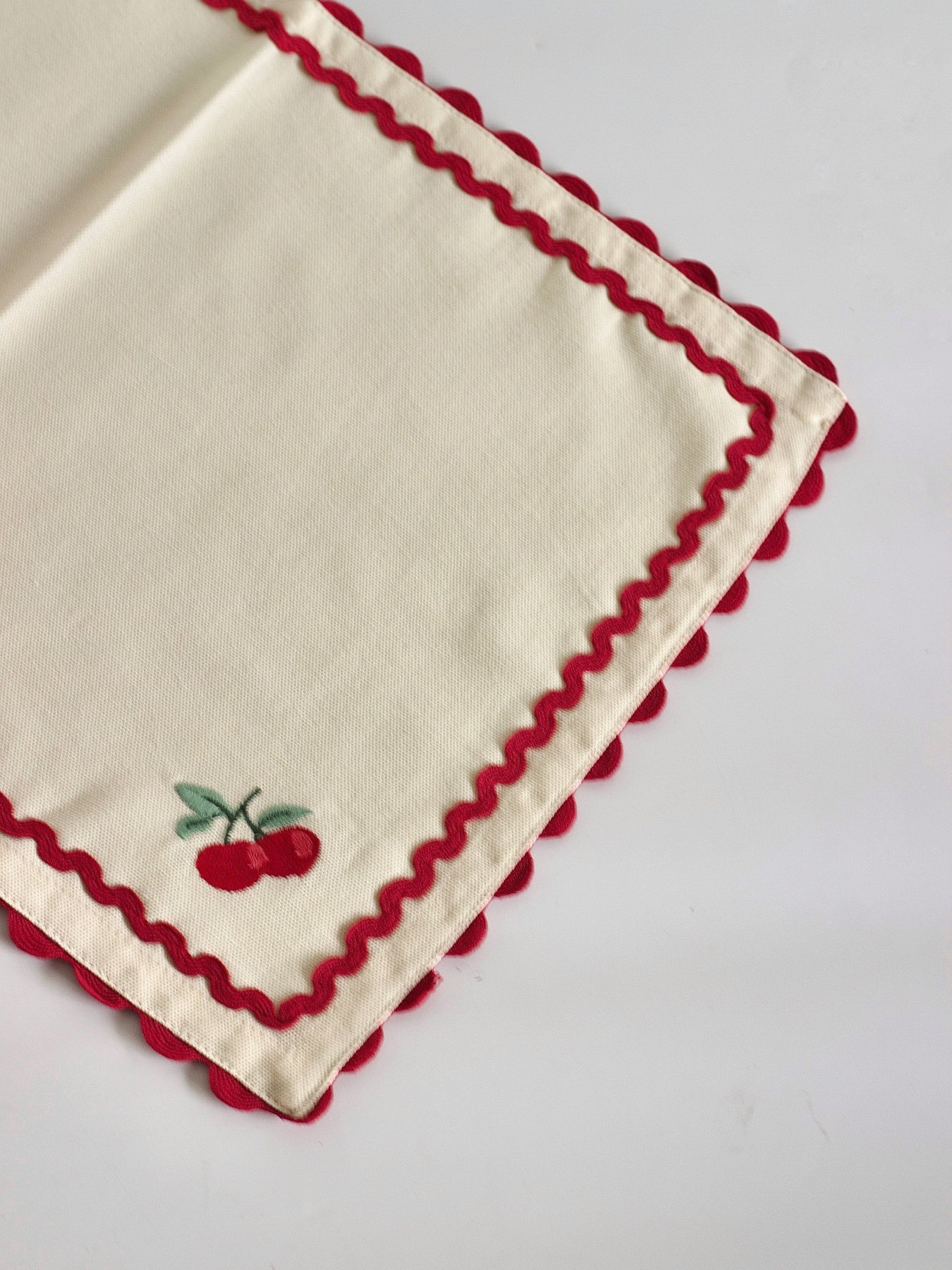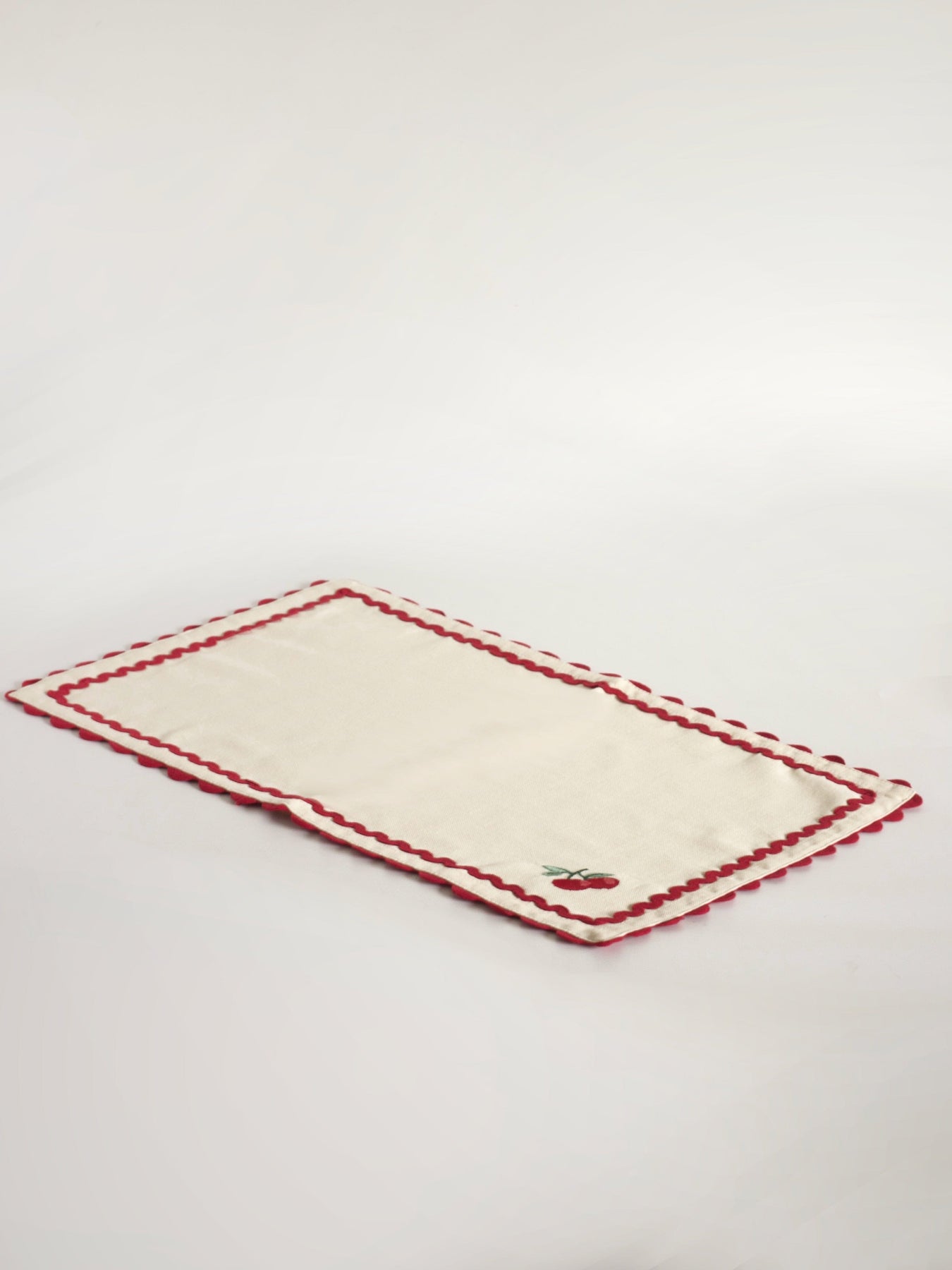 Product Description : Cream fabric placemats detailed with a charming cherry embroidery and bold, scalloped red edging. A classic, cheerful accent that adds warmth and character to any table setting.