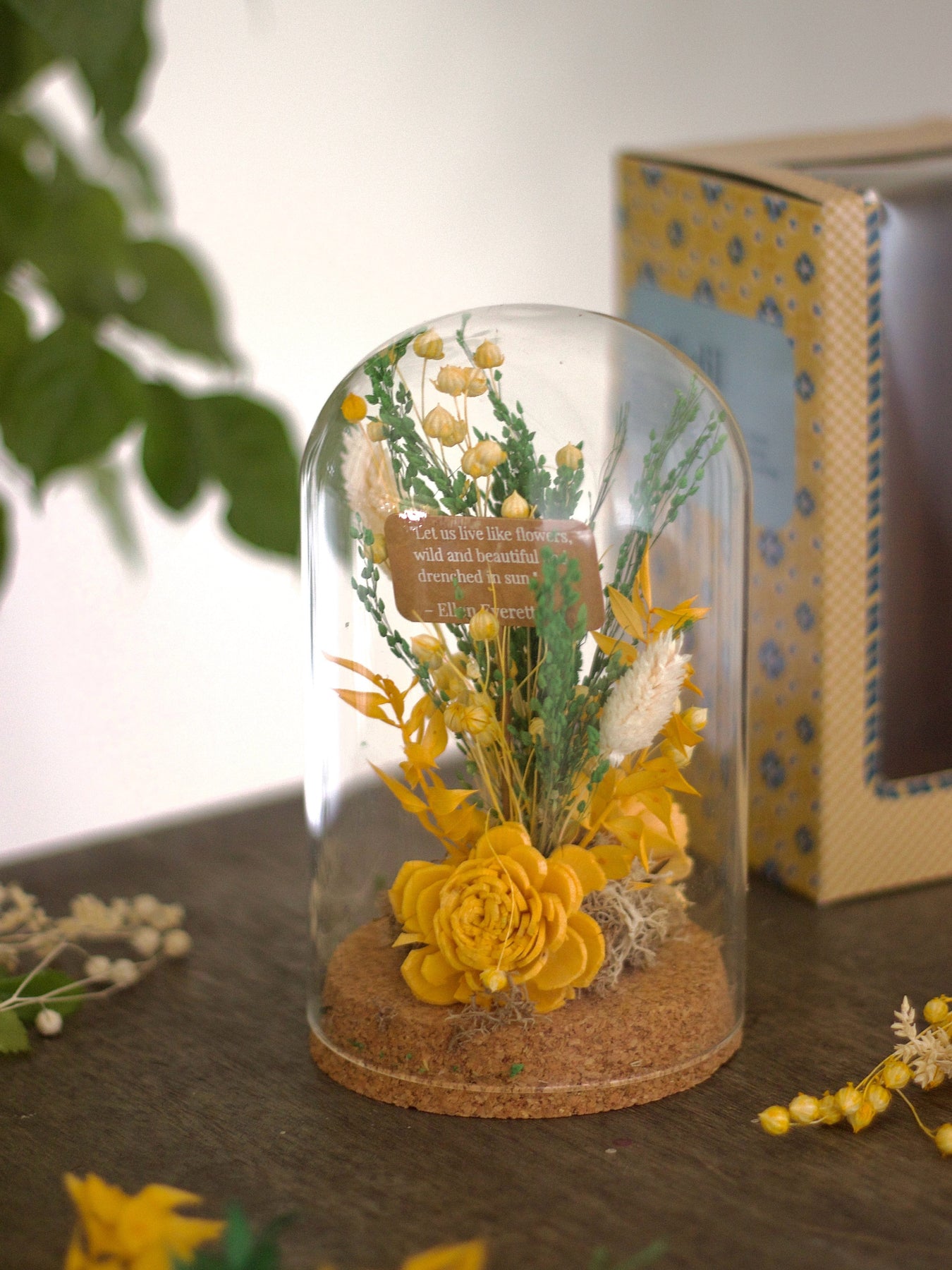 Product Description: A charming dried floral arrangement preserved under a clear glass dome, featuring soft green and yellow botanicals set on a natural cork base. A delicate décor accent that adds a romantic, timeless touch to shelves, desks, or bedside tables.