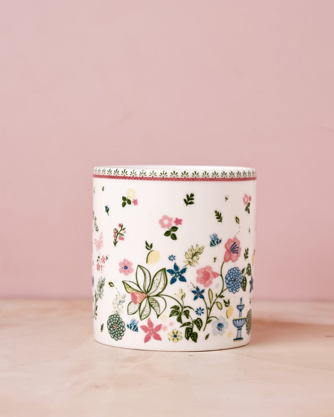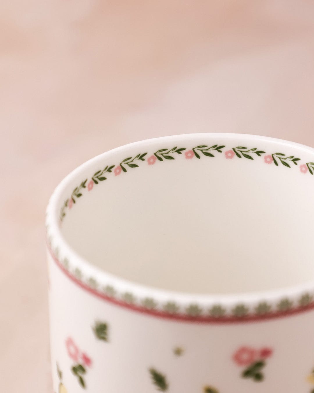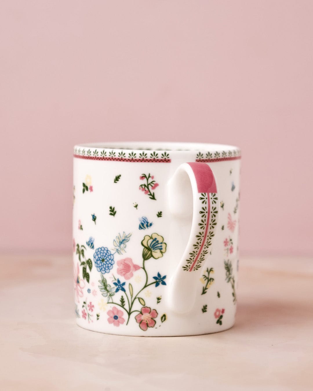 Elegant mug adorned with delicate floral patterns, perfect for enjoying tea or coffee.