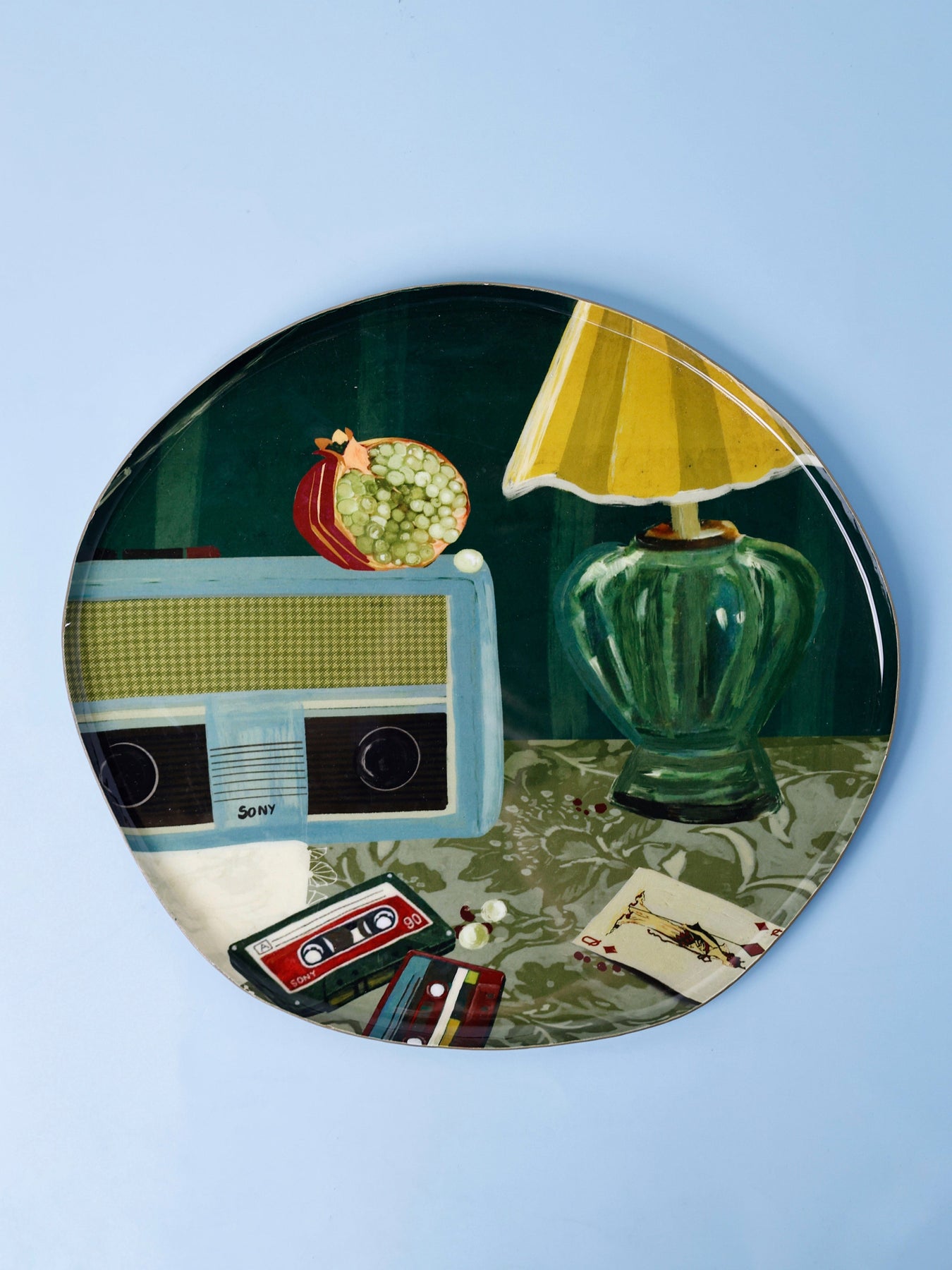 Product Description: Decorative wall plate with a retro-inspired design featuring a lamp, radio, tapes, and playing card, adding a nostalgic charm to your décor.