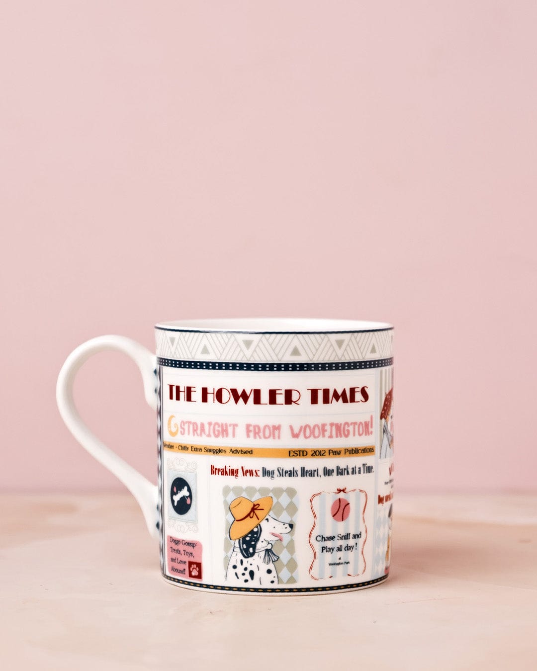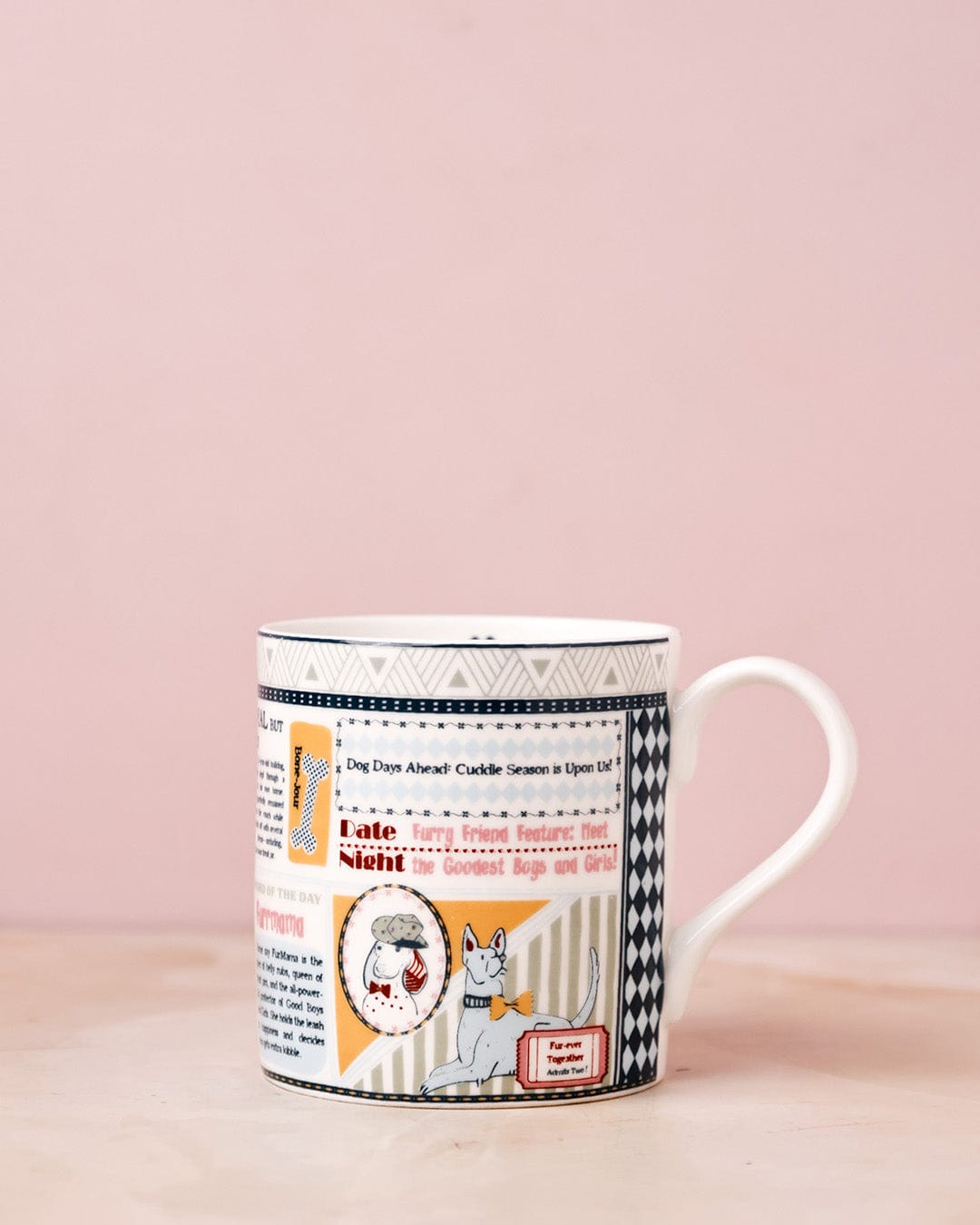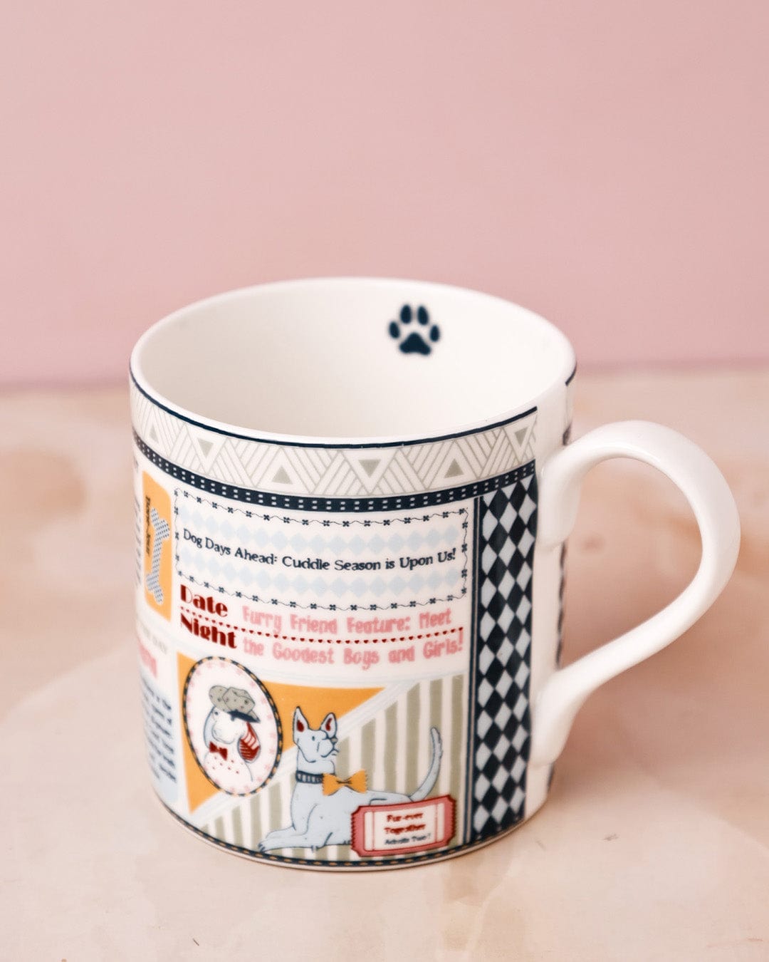 Stylish mug with newspaper-inspired print and playful illustrations, perfect for everyday beverages.